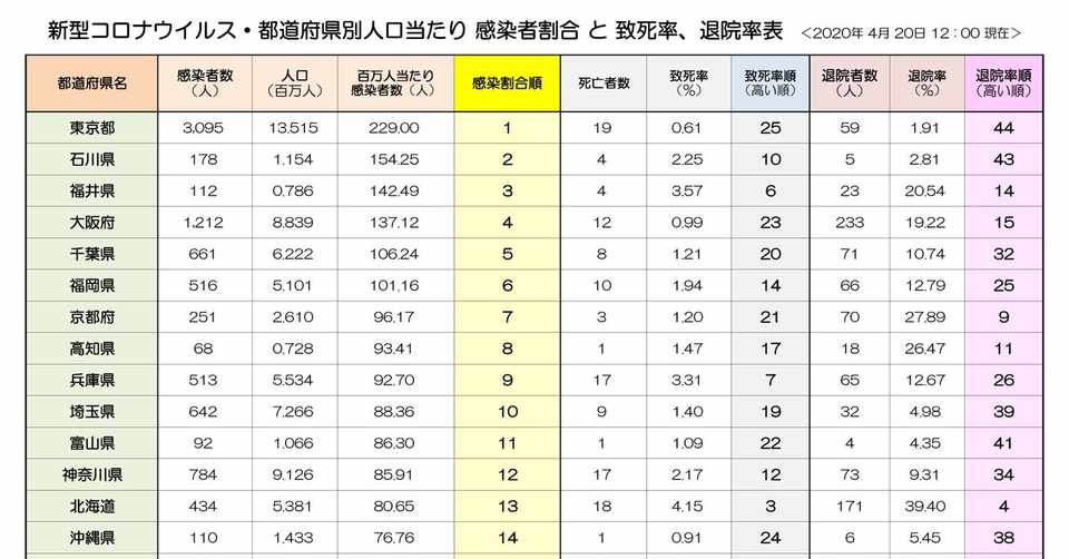 新型コロナウイルス 都道府県別 感染割合順位 死亡率等 一覧 4月日 正午 現在 妖怪大魔王 Note