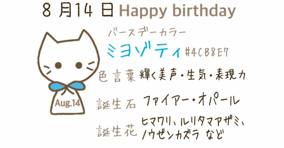 8月14日の誕生石誕生花バースデーカラーラッキーナンバー 8月14日生まれのあなたのバースデーカラーは、 「ミヨゾティ」 です。 ミヨゾティ. 8月14日に関する情報を知りたいですか? 本記事では記念日、雑学、誕生石・石言葉、誕生花・花言葉、誕生星・星言葉、誕生色・色言葉、誕生寿司・寿司言葉、誕生酒・酒言葉、誕生魚・魚言葉、誕生鳥・鳥言葉について詳しく解説をしています 贈り物・プレゼント・話のネタ等の参考になり. 誕生日からのメッセージ 1年に1度、どんな人にもやってくるスペシャルな祝日。 それが誕生日です。 私たち人間は、転生輪廻(生まれ変わり)を繰り返し、80年から0年の周期で生まれ変わり、魂の進化を遂げていると考えられています。.